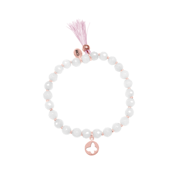 Pulseira elegante de pedra ágata rosa claro com pingente e borla. A pulseira elástica com pingente de borboleta simboliza a liberdade. Uma linda pulseira stretch que vem da coleção Serenity, desenhada pela CO88 Collection. A coleção Serenity é composta por pulseiras stretch da moda com pedras naturais de Jade ou Ágata, pingentes e borla. Disponível em várias cores. Por causa do tamanho fino de 6 mm, a joia é a armadura perfeita!