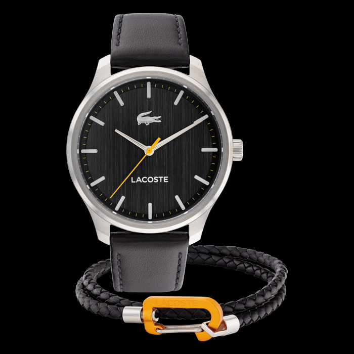 Gift Set LACOSTE composto por um relógio de edição limitada para homem, e uma pulseira. Para ele, o relógio LISBON, com um design clássico e elegante, com caixa em aço IP preto, mostrador preto e pormenor de ponteiro a amarelo, complementado com uma bracelete em pele de alta qualidade. A pulseira dupla em pele MATT, em preto, e pormenor de fecho em mosquetão a amarelo.