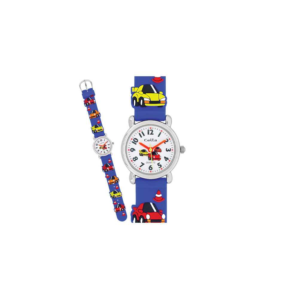 Relógio de pulso analógico com bracelete 3DCaracterísticas. Bracelete com desenhos em alto relevo. Cor: Azul. Tema: Carros