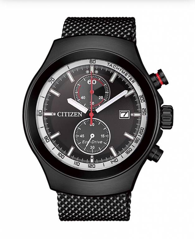 Caixa de aço de 42,5 mm diâmetro, 11,8 mm espessura com tampa rosca. Bracelete de aço mesh. Pontos luminous em mostrador e ponteiros. WR 10 bar.